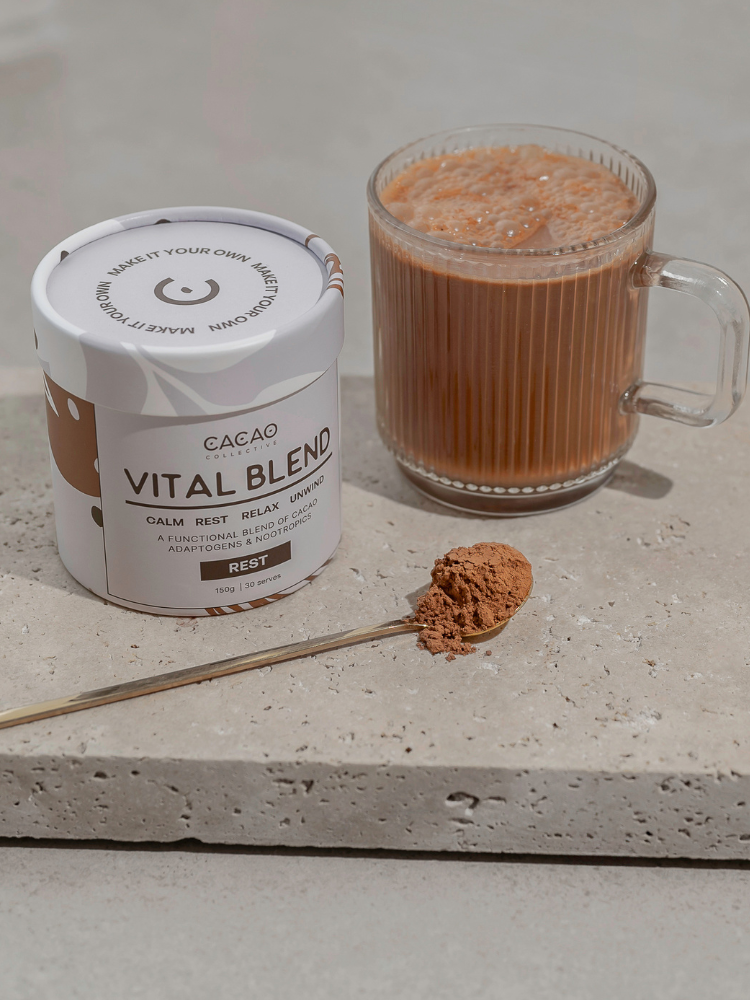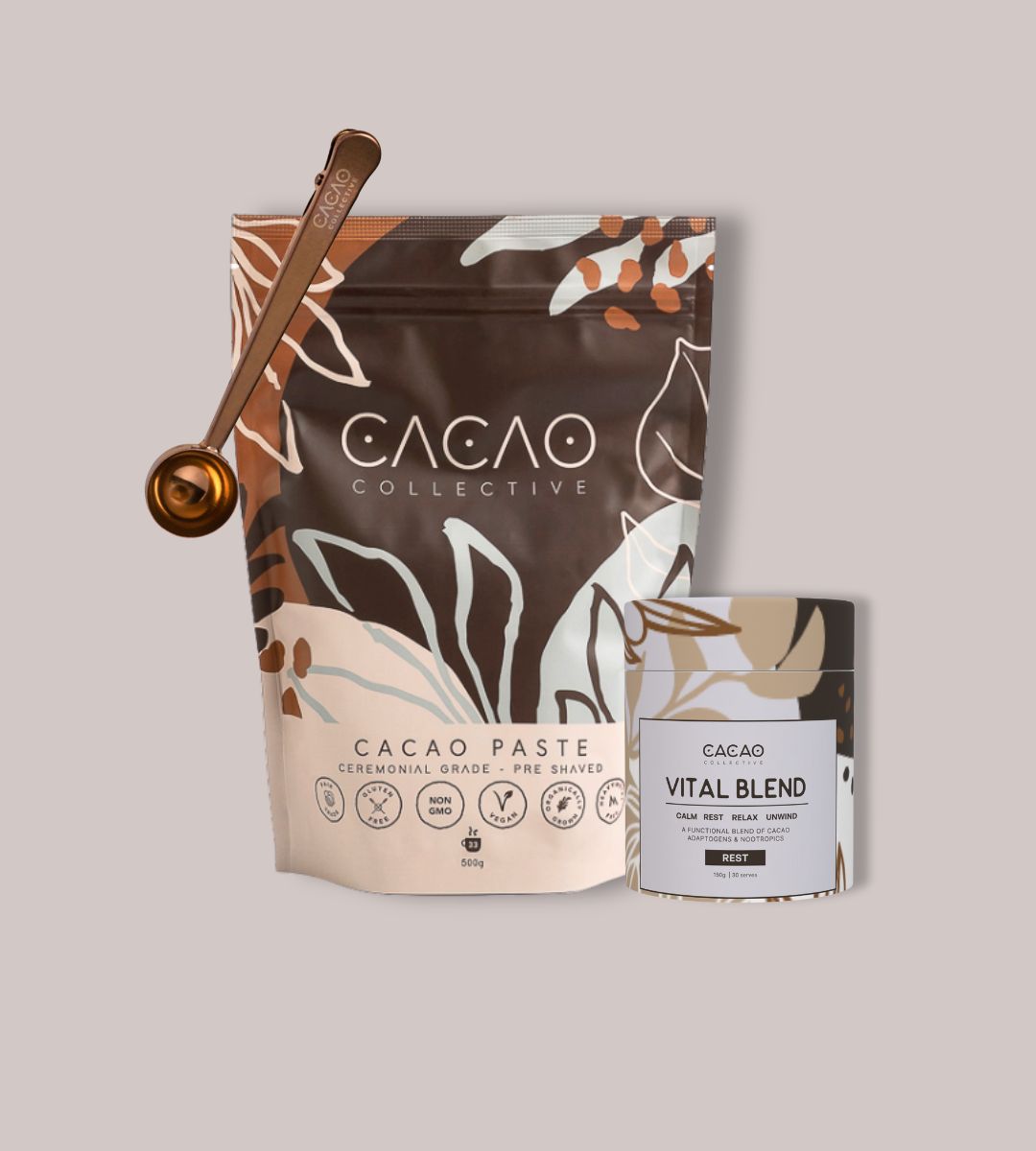 This Bundle Includes: - 500g ceremonial grade cacao (approx. 30 serves) A delicious coffee alternative that is naturally packed with essential minerals (magnesium, zinc and iron), antioxidants, and mood-boosting compounds to provide sustained energy and focus throughout the day. - 150g Tub of Rest Vital Blend (approx. 30 serves) This blend can be added to any beverage to experience the benefits. - Cacao Scoop These handy food-grade stainless steel cacao scoops are perfect for measuring out your daily dose (holds exactly 10g of shaved cacao).