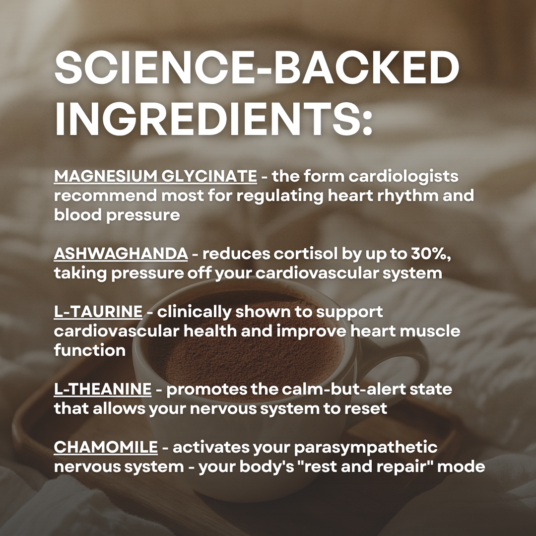 Complete Stress Recovery - Cacao's natural mood-boosting compounds prepare your nervous system for rest, while REST's adaptogenic ashwagandha reduces cortisol by 30%—protecting your heart from stress damage overnight.