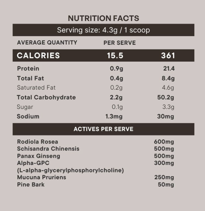 Organic ceremonial grade cacao powder, Alpha GPC, Mucuna Puriens, Schisandra Chinensis, Panax Ginseng, Pine Bark, Rhodiola Rosea, Natural Favour.